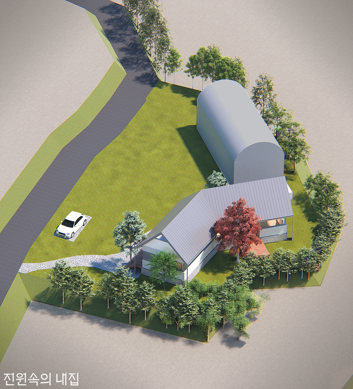 기존 나무를 지키면서, 반려묘, 반려견과 함께 지낼 수 있어야 했다. 여기에 건축주는 하나의 공간과 탁 트인 풍경을 명확하게 요구했다. 대지 주변에 펼쳐진 풍경처럼 수평으로 쭉 뻗은 공간과 집이라면 해답이 될 것 같았다. 단순한 공간으로 주변 자연을 최대한 끌어들이기로 했다. 자연과 살아가는 집이길 바라며, 농촌에서 자주 보게 되는 전통적인 ‘ㅡ’자형 또는 ‘ㄱ’자형 집과 길게 튀어나온 처마 등을 재해석하고자 했다.