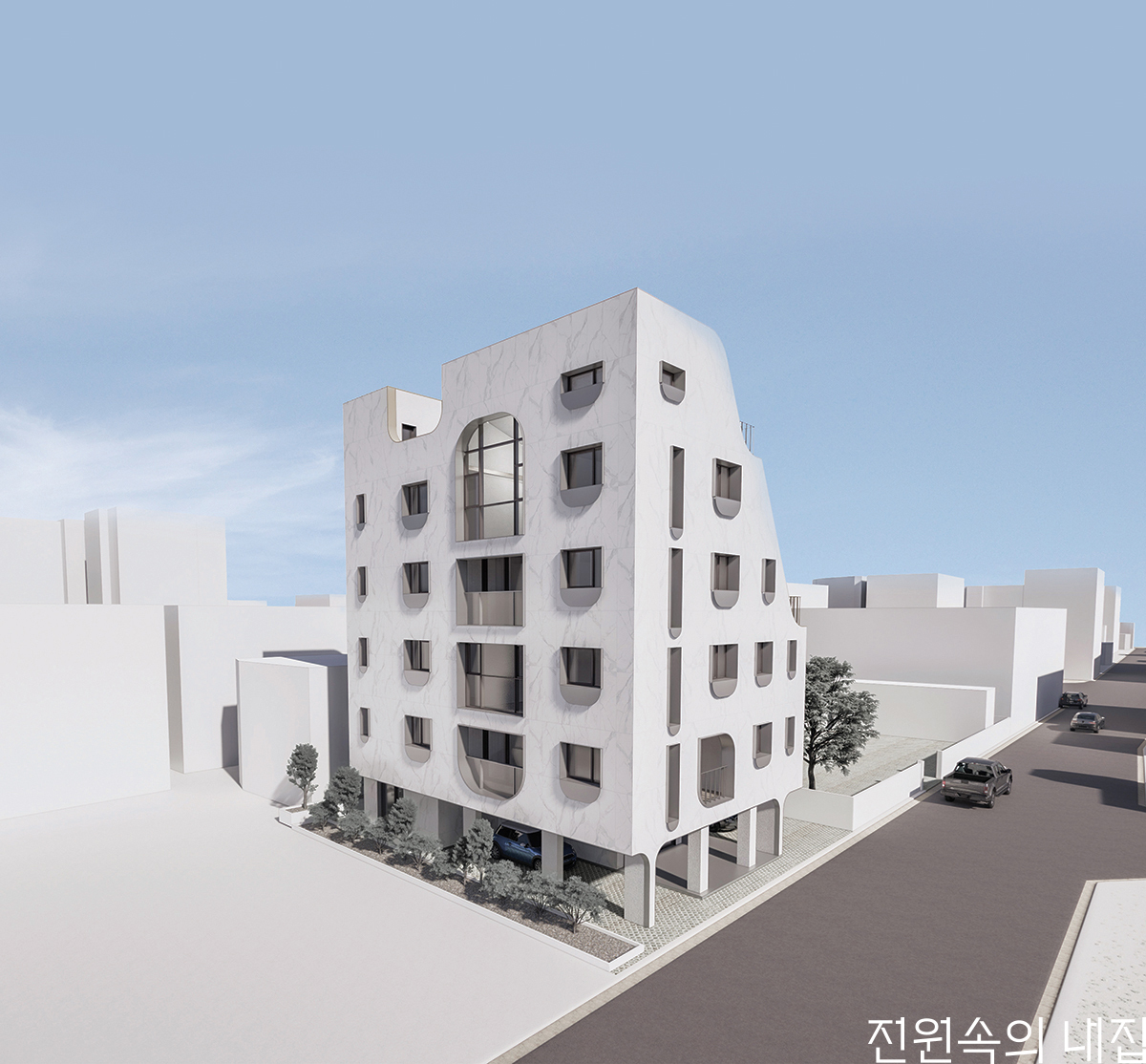 코어 배치의 변화 | 남북으로 여유가 있는 대지 조건 덕분에 정북 일조권 적용으로 공용부인 코어를 남서측에 배치해야 하는 제약을 받지 않아도 되었다. 결과적으로 채광이 좋은 남쪽 면을 모두 실내로 들여 각 세대의 평면에 반영할 수 있도록 계획했다. 라운딩 처리된 창들은 매스 선과 어우러져 건물 내·외부 디자인 요소로서 기능한다.