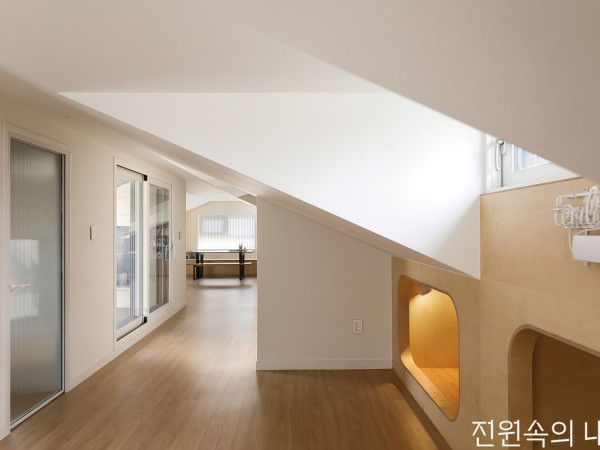 사는 이의 가치관과 삶의 흔적이 고스란히 기록되는 공간, 집. 깨끗한 도화지 같은 바탕에 곡선과 은은한 조명이 어우러져 따스한 분위기를 낸다.사랑스러운 두 딸과 엄마, 아빠가 함께 따스한 일상을 만들어가는 새 보금자리. 1층과 2층, 다락으로 구성된 타운하우스 주택은 가족의 삶과 취향을 담아 보드랍고 포근한 공간을 이룬다. 1층에는 주방과 다이닝, 거실, 욕실, 아이방이, 2층에는 갤러리 같은 소거실과 안방, 욕실과 드레스룸, 작은방이 놓였다. 다락으로 오르면 나지막한 박공지붕의 놀이 공간, 넉넉한 수납공간과 테라스가 자리한다. 구조 변경은 거의 없었지만 군더더기 없는 새하얀 여백에 곡선과 간접 조명, 생활을 고려한 편의 요소들이 더해진, 가족에게 꼭 맞춘 집이다.현관에서 거실로 이어지는 복도를 따라 주방과 다이닝룸, 계단실과 욕실이 있다.복도의 회색 벽면은 핑크 톤 욕실이 대비를 이루며 포인트가 되어준다. 곡면 처리한 코너 덕분에 동선이 자연스럽다.널찍한 아일랜드 키친은 대리석 패턴의 박판 타일로 마감했다. 주방을 지나 집 모양 창을 낸 문이 있는 곳이 아이방이다.안으로 들어와 가장 먼저 마주하게 되는 현관은 이 집의 축소판과도 같다. 흰색이지만 따뜻한 톤의 마감재와 신발장이 있는 아치문, 천장의 곡면 디테일 등이 인테리어 콘셉트를 함축적으로 보여준다. 중문을 열고 곡면의 코너를 자연스럽게 돌아서면 긴 복도를 따라 널찍한 주방이 나타난다. 맞은편의 회색 벽면은 마이너스 메지로 면을 분할해 단조롭게 느껴지지 않도록 했으며, 분할된 면에 맞게 계획된 문 뒤로 핑크빛 욕실이 숨어 있다.화이트&우드 조합의 다이닝룸. 벽에 원형 매립 선반을 만들어 취향에 따른 디스플레이 연출이 가능하다.주방에서 연결되는 세탁실. 넉넉한 수납이 가능한 팬트리가 숨어있는 곳이기도 하다.주방에는 요리를 좋아하는 엄마의 특별 요청으로 2,800×1,100(mm) 크기의 아일랜드 키친을 만들고, 대형 박판 타일을 적용해 이음매 없이 매끈하게 마감했다. 널찍한 아일랜드가 장 본 물건들을 정리하기에도 편리하다고. 이어지는 동선의 다이닝은 우드와 화이트가 어우러진 심플한 공간으로, 벽에 원형의 무늬목 매립 선반을 배치해 카페 같은 분위기를 물씬 풍긴다.시원한 공간감의 거실. 아트월 좌측 코너를 곡면으로 처리해 커튼을 걷었을 때 숨길 수 있는 커튼 박스를 만들었다.POINTPOINT 1_현관 신발장내부 디자인을 함축적으로 보여주는 현관. 밖으로는 벤치형 수납장만 하나 두고, 아치형 출입구에 미닫이문을 설치하여 숨은 신발장을 마련했다.POINT 2_자매를 위한 벙커룸놀이방으로 활용할 아이방은 계단과 사다리가 있는 벙커룸으로 구성했다. 복층 공간은 퀸사이즈 매트리스 크기를 기준으로 하여 침대로도 쓸 수 있다.POINT 3_다락 테라스집 안에 머무는 시간이 많은 요즘, 더욱 소중해진 다락 테라스에는 개방감 있는 폴딩도어를 설치했다. 마당을 대신해줄 프라이빗한 야외 공간이다.거실은 이 집의 하이라이트. 무려 5.3m에 달하는 천장고의 시원한 공간감을 자랑한다. 리모델링을 맡은 그루아키텍츠는 이 개방감을 극대화하기 위해 기존 몰딩과 단차를 정리해 미니멀한 벽면과 천장을 완성했다. 곡선 디자인의 천장 간접 조명에서는 빛이 부드럽게 퍼지고, 시원하게 트인 전면 창에는 싱그러운 바깥 풍경이 가득 담긴다. 아트월 창가 측에는 커튼을 걷어 숨길 수 있는 곡면 벽을 만들어 자연스럽게 커튼 박스를 만들어주었다. 창문 맞은편 벽면은 테라코트 슈퍼화인으로 마감하여 벽면에 노을빛이 비칠 때, 밤에는 업라이트 간접 조명을 받을 때 특유의 텍스처가 살아난다.하나의 방 안에서도 다양한 공간을 넘나들며 재미있게 놀 수 있는 아이방. 자매를 위한 아지트가 되어줄 벙커룸이다.벙커 계단 하부는 옷장과 선반을 만들어 활용했다. 방문에 낸 창은 부모가 아이들이 놀이하는 모습을 언제든 확인할 수 있게 해준다.자매의 놀이방으로 사용되는 아이방은 거실 반대편 끝에 자리한다. 벙커룸, 박공지붕 출입구, 계단과 사다리 등 다양한 공간 요소가 모여 있어 키즈 카페 못지않은 곳이다. 벙커룸 2층 공간에서 아이들은 크고 작게 열린 창 너머로 다양한 시선을 경험할 수 있으며, 간접 조명을 설치해 천장고를 최대한 확보하고 눈부심을 예방하는 배려도 잊지 않았다. 특히 퀸사이즈 매트리스 크기에 맞춰 디자인, 제작하여 아직 어린 아이들이 좀 더 자라면 방을 분리해 침대로 활용할 수 있게 한 점이 인상적이다.INTERIOR SOURCE대지위치 ≫경기도 김포시 거주인원 ≫4명(부부 + 자녀 2) 연면적 ≫226.46㎡(68.50평, 다락 및 테라스 65㎡ 포함) 내부마감재 ≫벽 - 벤자민무어 스카프엑스, 테라코 테라코트 슈퍼화인 스프레이 / 바닥 - 세림세라믹 수입 포세린 타일, 구정마루 스웨디시화이트(셰브런), 구정마루 브러쉬 골드 티크스카치(셰브런) / 천장 - 벤자민무어 울트라스펙 욕실 및 주방 타일 ≫세림세라믹 수입타일 수전 등 욕실기기 ≫더죤테크, 아메리칸스탠다드, 퓨로 양변기, 세면대·수건장 –자체 제작 주방 가구 ≫자체 제작(살리체 하드웨어, 리얼스톤 빅슬랩 타일 상판), 한스그로헤 