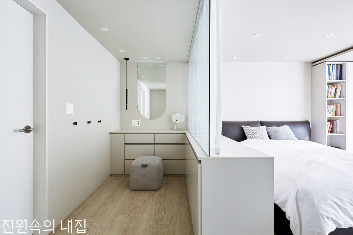 실거주자의 프라이버시가 확보되면서 편하게 생활할 수 있도록 창의 위치 등을 고민해 설계한 침실. 침대와 협탁, 화장대 겸 책상은 무늬목을 사용하여 호텔 콘셉트로 전체 제작하고, 메인등 없이 간접 조명과 LED 스팟조명으로만 계획하였다. 침실과 연결된 파우더룸은 우측은 드레스룸, 좌측은 욕실로 구성되어 좀 더 여유롭게 사용 가능하다. somyung gonggan