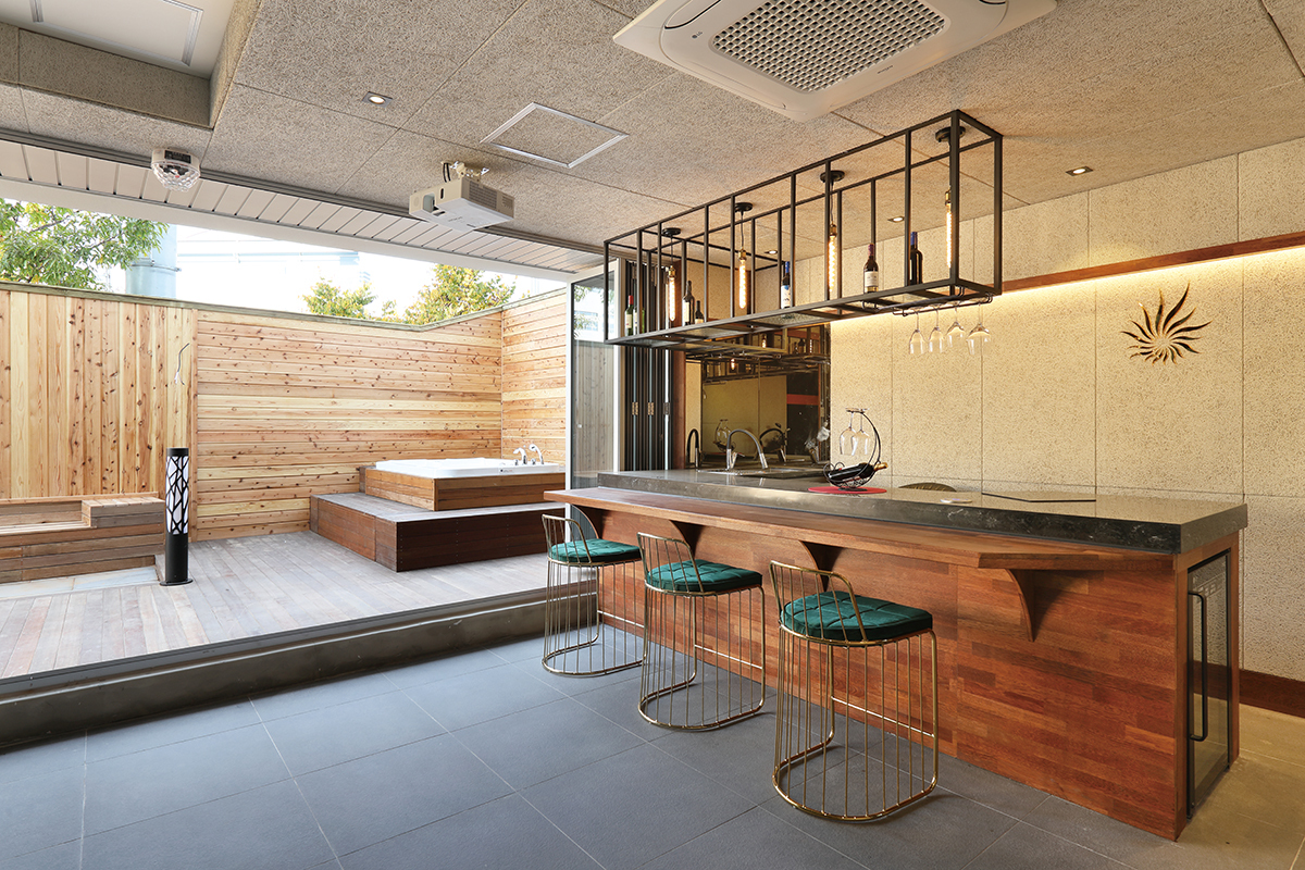 ▲ 원목과 대리석을 이용한 테이블, 골드 프레임 의자, 간접조명으로 계속해서 머물고 싶은 미니 바를 만들었다. 도원건축디자인그룹