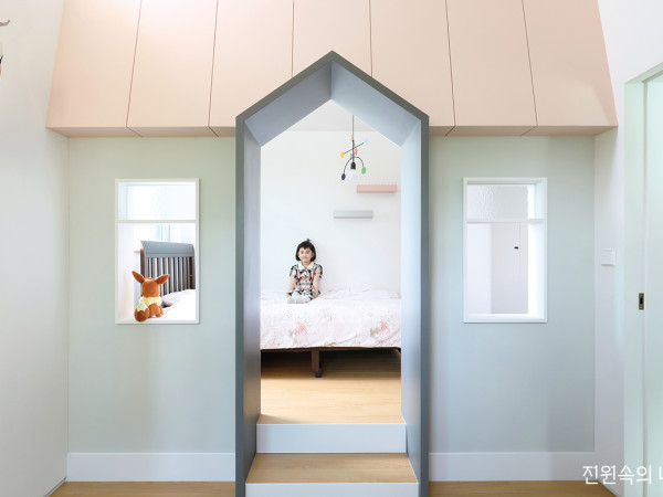 모퉁이 땅에 자리해 유독 눈길을 끌며궁금증을 자아내는 주택, 그 속내가 궁금하다.둥근 천장 덕분에 독특한 공간감을 연출하는 것은 물론, 천창으로 쏟아지는 빛의 움직임이 시시각각 실내에 드러나는 거실다가구주택이 즐비한 경기도 파주 운정신도시 내 택지지구. 한눈에 봐도 경제 논리로 지어진 빽빽하고 재미없는 건물들 사이, 교차로를 낀 모퉁이 땅에 들어선 집 한 채가 시선을 사로잡는다.재료도, 형태도, 입구도 독특한 이 건물. 1층은 아동청소년발달센터로, 2층은 센터를 운영하는 부부가 주거공간으로 쓰는, 일종의 소형 상가주택이다. 결혼 후 줄곧 아파트에서 살아 온 부부는 직주일치의 삶을 꿈꾸며 그들의 첫 번째 단독주택을 지어줄 전문가를 찾아 나섰고, 이들의 파트너로 비유에스아키텍츠 건축사사무소가 낙점되었다.바라보는 방향에 따라 다른 도형, 다른 느낌을 내는 주택의 외관. 자가세척 기능이 있는 세라믹 타일과 미색의 외단열 미장 마감이 따뜻한 분위기를 자아낸다.남쪽이면서도 배면에 위치한 주거공간 출입구와 주차장. 전면과는 또 다른 인상을 풍긴다.PLAN① 아동청소년발달센터 ② 현관 ③ 주차장 ④ 진입마당 ⑤ 거실 ⑥ 주방 ⑦ 방 ⑧ 드레스룸 ⑨ 화장실 ⑩ 다용도실 ⑪ 발코니 ⑫ 다락HOUSE PLAN대지위치▶ 경기도 파주시 |대지면적▶ 268.5㎡(81.22평) |건물규모▶ 지상 2층 + 다락 |거주인원▶ 4명(부부 + 자녀 2) + 반려견 1건축면적▶ 43.37㎡(43.36평) |연면적▶ 244.12㎡(73.84평)건폐율▶ 53.4% |용적률▶ 90.9%주차대수▶ 2대 |최고높이▶ 8.65m구조▶ 기초 - 철근콘크리트 매트기초 / 지상 – 경량목구조 2×6 구조목(벽), 2×10 구조목(지붕)단열재▶ 하이셀 셀룰로오스 단열재외부마감재▶ 외벽 - 파렉스 외단열시스템, 아이코트료와 세라믹타일 / 지붕 – 컬러강판창호재▶ 알파칸 PVC 삼중창호(에너지등급 2등급)조경▶ MWDLAB전기·기계·설비▶ GM엔지니어링구조설계▶ 금나구조시공▶ 신민철 010-8953-1375설계▶ 비유에스아키텍츠 건축사사무소 박지현, 우승진, 조성학(위, 아래) 아동청소년발달센터로 사용하는 1층. 실내는 휘발성유기화합물이 없는 페인트, 천연원료로 구성된 리놀륨 바닥재 등 친환경 소재로 마감해 아이들 손이 닿는 곳 모두 섬세하게 신경 썼다.비슷비슷한 건물들 사이에 들어선 동그랗고 뾰족하고 네모난 집“이전 회사 사옥 건축에 참여할 때 고생했어요. 설계자가 도면만 납품하고 현장을 들여다보지 않거나, 인테리어 업자도 중간에 도망가버리기도 했죠. 주택은 특히 일상과 밀접하기 때문에 섬세한 부분이 많잖아요. 끝까지 믿고 맡길 전문가가 필요했어요.”인터넷에 소개된 기사와 인터뷰 등을 보며 비유에스의 젊지만 강단 있는 모습이 인상적이었다는 건축주. 작은 주택 하나도 작품처럼 여기고 준공 이후까지 신경 쓰는 점이 특히 마음에 들었다고.설계를 진행하며, 이 집 역시 처음에는 인접한 건물들처럼 다가구주택으로 지으려 했지만, 주차와 1층 면적, 어린이 진출입 문제 등을 고려해 2층 규모 단독주택으로 선회했다. 결과적으로 동화적이면서도 동네에 새로운 풍경을 부여하는 건물이 완성되었다.문보다 높이 매달린 담장과 삼각형 조각마당을 지나면 만나는 1층은 오직 센터로서의 역할에 충실한 모양새. 대신, 기능적으로 실을 배치하면서도 목재 천장과 톤 다운된 색상, 친환경 마감재, 군데군데 낸 창으로 비치는 조경 요소들이 아이들에게 편안한 공간감을 선사한다.ZOOM IN아이와 어른 모두 즐거운 이상하고 신기한 출입문바닥에서 들어올린 담장과 덩그러니 있는 출입문은 마치 현대미술을 보는 듯하다. 이는, 아이와 어른의 진입방식을 분리해주고자 배려한 건축가의 재치가 엿보이는 아이디어다. 이 문을 통과하며 삼각형 조각하늘을 지나 실내로 들어선다.DIAGRAM주거공간인 2층. 방과 드레스룸 등 기능적인 공간은 모두 한 방향으로 몰고 거실과 주방을 통합해 넓게 구성했다.채광과 감성 더한 천창이 백미인 내부 공간지붕에서 짐작할 수 있다시피 사무실과 달리 주거공간인 2층에선 과감한 제스처가 드러난다. 둥근 천장의 볼트에 길이 방향으로 낸 천창이 특히 눈길을 끈다.“주택 남쪽에 이미 지어진 집들의 큰 창문들이 면해 있었습니다. 거실과 주방을 북향에 두고 빛이 충분히 들어올 수 있도록 천창을 내어 조망과 채광에 대한 고민을 해결했습니다.”형태 너머 생활을 고려한 건축가의 배려로 구현된 공간. 건축주는 소파에 누워 천창을 통해 지나가는 구름을 보는 즐거움을 알게 되었다니 감성까지 충족한 셈이다.주택에 오면서 이전보다 여유가 생긴 것 같다는 소회를 남긴 건축주. 원하는 시간에 세탁기를 돌릴 때, 반려견이 발코니를 쓸 때, 숙면을 취할 때 등 대단하진 않아도 소소한 일상의 기쁨이 삶을 채울 때, 집 짓기 참 잘했다는 생각이 든다고. 그렇게 서서히 주택생활의 묘미를 알아가는 가족에게 오늘도 천창으로 따뜻한 가을볕이 쏟아진다.세 개의 방 중 하나는 천창이 이어진다.벽에 면해 여유롭게 주방가구와 가전을 배치하고 아일랜드로 중심을 잡은 주방INTERIOR SOURCE내부마감재▶ 벽 – 벤자민무어페인트, LG하우시스 지아 / 바닥 - 