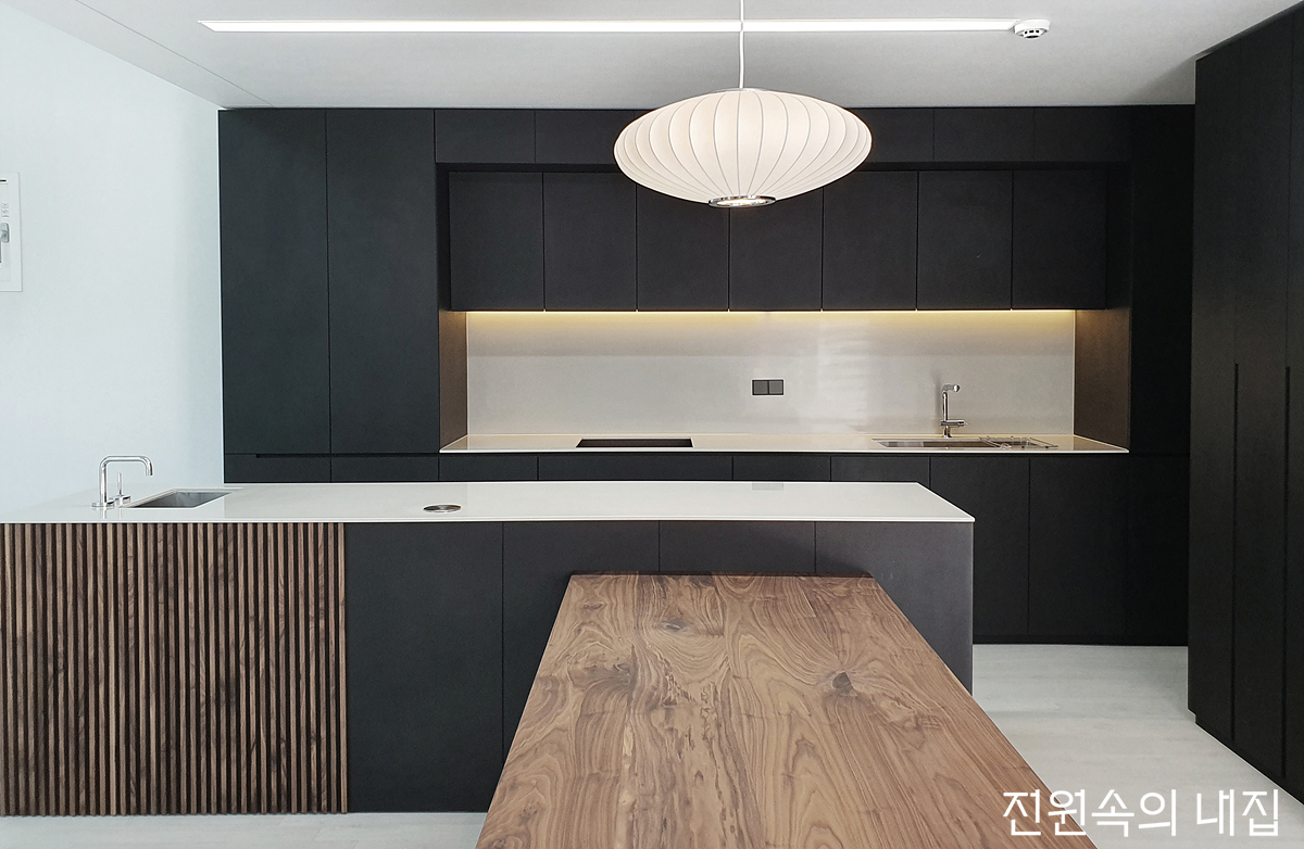 ▶ 블랙과 우드로 톤을 맞춘 간결한 디자인의 주방. 자칫하면 어두운 느낌을 줄 수 있어, 상부장 안에 매입등을 설치했다. _ 팀오더메이드