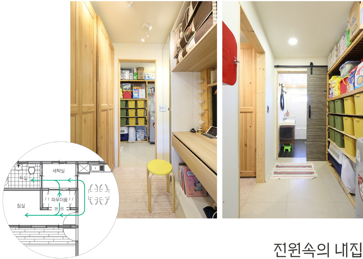 ▲ 파우더룸을 경계 삼아 세탁실을 통해 화장실을 함께 쓴다. 회유 동선을 통해 진입할 수 있는 경로를 두 가지로 만든 것이 특징. 몬슨하우스