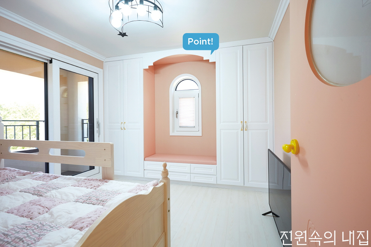 방에 나 있는 작은 창문을 살려 그 주변을 붙박이장 형태로 제작하되, 윈도 시트를 만들고 그 하단은 서랍 공간을 확보했다. 윈도 시트 상단의 몰딩도 단순한 모양이 아닌 집안 전체 디자인과 연결되도록 클래식하게 제작했다.