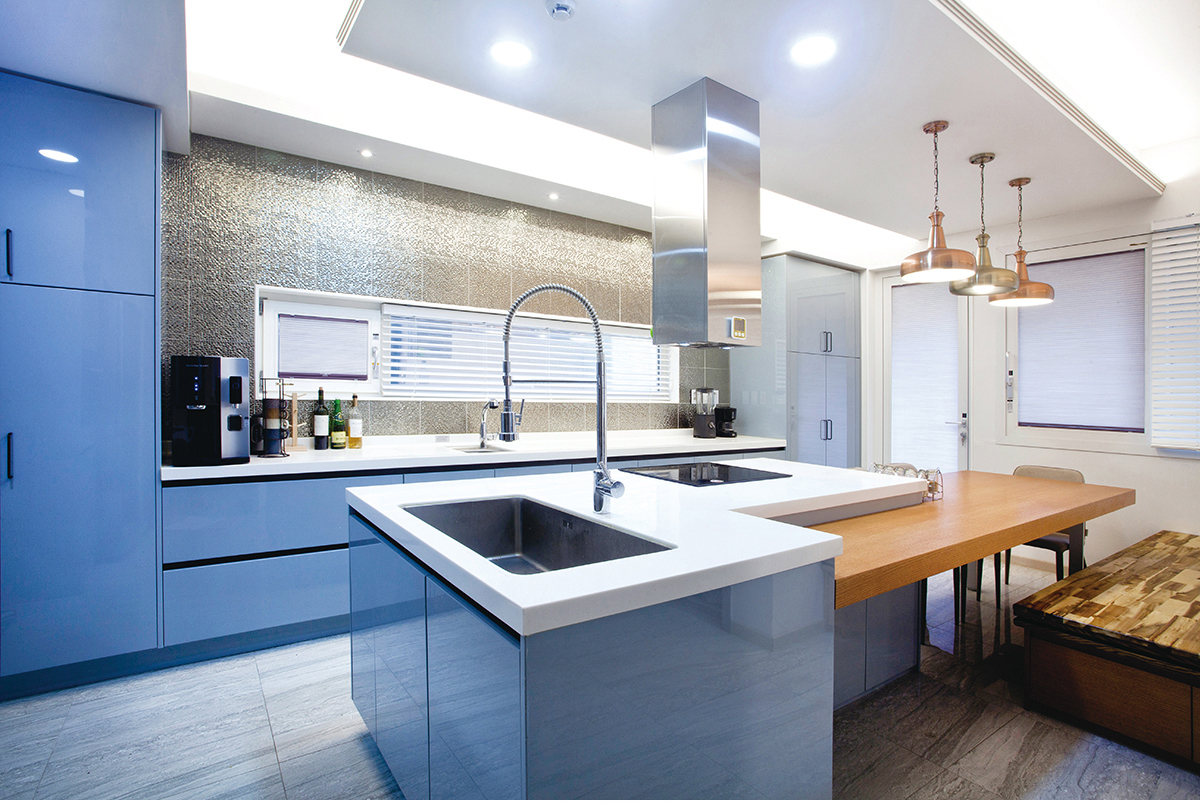 최근 요리 프로그램이 인기를 끌면서 남자들이 부엌으로 들어와 일하는 것이 보편화되었다. 덕분에 싱크볼을 두 개 설치하는 사례가 늘고 있는데, 둘이 함께 요리를 하거나 조리와 설거지를 동시에 할 수 있어 유용하다. 위의 사례는 아일랜드 주방과 식탁 상판을 각각 ‘ㄱ’자 형태로 제작해 맞물린 디자인이다. 아일랜드에 메인 싱크볼과 인덕션을 설치하고 벽 쪽으로 작은 볼을 하나 더 두었다. 4인 가족 모두 요리를 즐기는, 맞춤형 주방 가구 사례다.