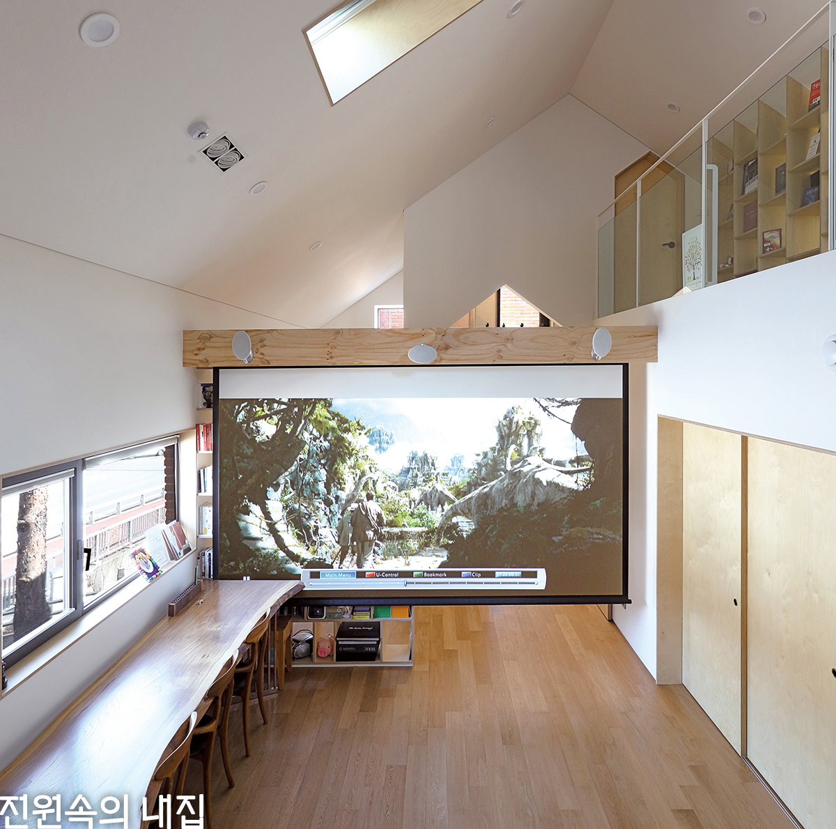 ▲ 1층 거실의 오픈천장 너머에 스크린을 내려 만든 가족만의 극장. 부부가 좋아하는 영화를 보거나 아이들을 위해 애니메이션을 틀기도 한다. 홈스토리하우스