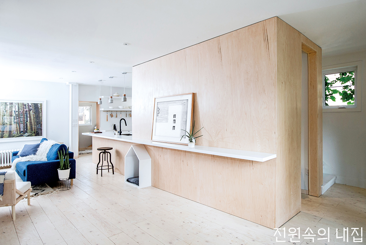 캐나다 토론토에 설계된 주택. 자작나무 합판으로 완성된 ‘집 속의 집’ 같은 이 공간은, 현관으로 들어와 바로 외투를 벗어 걸어둘 수 있는 옷장과 2층으로 연결되는 계단실, 주방 하부장 및 수납장 등을 모두 겸하고 있다. 특히 남은 합판 조각에 흰색 페인트 칠을 해 완성한 반려견을 위한 공간은 이 집만의 포인트가 되어준다. StudioAC / ⓒSarjoun Faour
