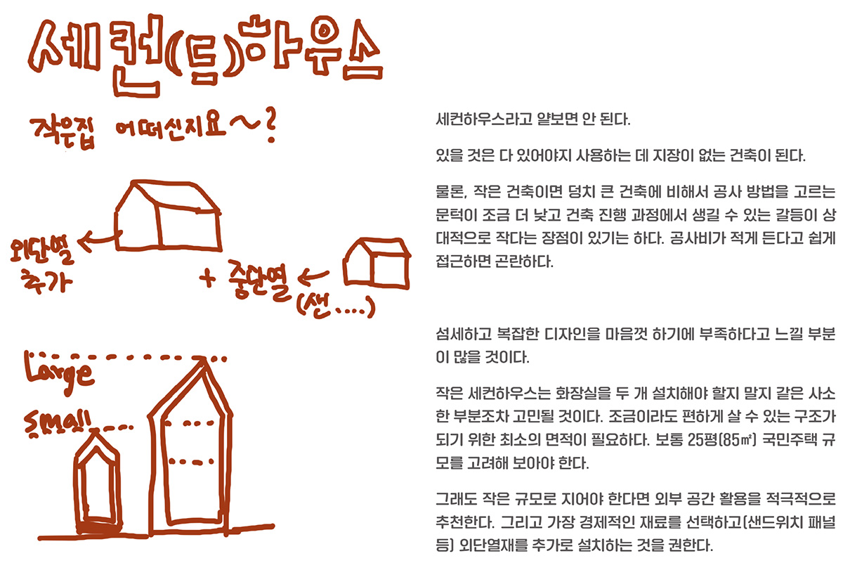 하지만 이런 분들도 몇 년 내에 자신만의 집짓기로 돌아설 것으로 자신한다. 되돌아 생각해 보면 차 한 대만 보유해도 큰 부잣집처럼 여기던 것에 비해 지금은 각자 집에 두 대 정도는 기본일 정도로 변화했다. 집도 마찬가지일 것이다. 상속이나 증여처럼 세무 처리가 복잡해서 어렵게 생각할 수 있지만, 충분히 사용하고 누군가에게 넘길 수 있다면 부담도 적을 것이다. 세컨하우스가 충분히 대안이 될 것으로 판단된다.