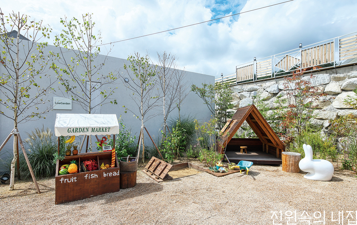 너른 정원과 그 안을 뛰어노는 아이들의 모습이 자연스레 그려지는 공간. 강릉에 위치한 키즈 스테이 ‘낮은 정원’에는 아이들을 향한 마음이 듬뿍 담긴 다양한 테마의 정원들이 있다. 정원은 삼각형의 건축물을 중심으로 크게 세 영역으로 나누어진다. 손님을 맞이하는 입구의 잔디 정원, 자갈 바닥으로 꾸며져 휴양지에 놀러 온 듯한 분위기의 뒷마당, 숙소 중앙에 조성된 아늑한 중정 마당까지. 아이들이 좋아할 만한 디테일한 요소들을 공간 곳곳에 적용했다. 중정은 발랄한 외부 정원과 다른 분위기로 아늑하게 꾸며져 가족 모두가 편히 쉬는 쉼터가 되어준다.