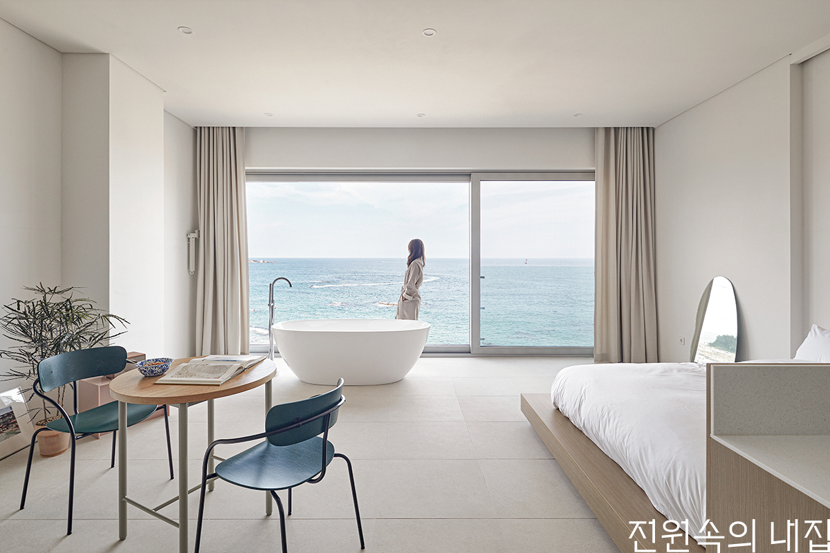 가장 정성을 들여서 객실 내의 온수탕이 마음이 가는 공간이에요. 아침과 밤 가리지 않고 언제든 따뜻한 노천욕을 할 수 있죠. 느긋하고 편한 자세로, 테라스에서 바람을 맞으며 보는 아야진 바다는 정말 감동적이기 때문에 더 애착이 가요.