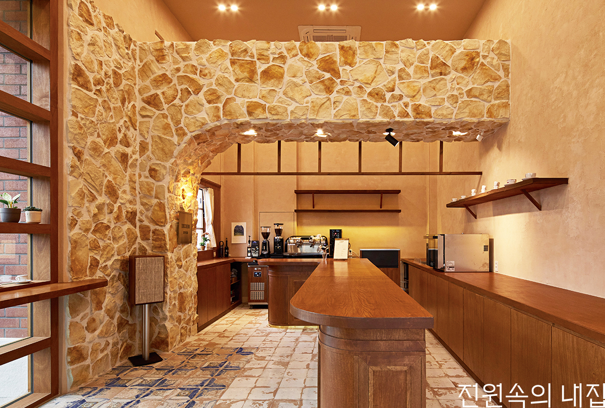 다양한 업종들이 함께 입점한 대형 아파트의 상가. 그중 유달리 이국적인 분위기를 풍기는 카페 건물이 있다. 최근 인기를 얻고 있는 이탈리아 정통 에스프레소 전문 바(Bar)로, 점주가 원했던 스타일 역시 이탈리아 본토의 느낌을 상업 시설로 그대로 가져오는 것이었다. 이국적인 빈티지 스타일을 위해 천연석재와 마호가니 컬러의 목재를 조화롭게 사용해 살짝 거칠면서도 편안한, 피렌체의 어느 뒷골목 가게 같은 분위기로 연출했다. 특히 바닥의 빈티지 타일은 흰색과 지중해풍의 푸른색이 함께 사용되어 상부와 아치형 구조에 적용된 천연석재와 어우러져 특별한 포인트 공간이 된다.